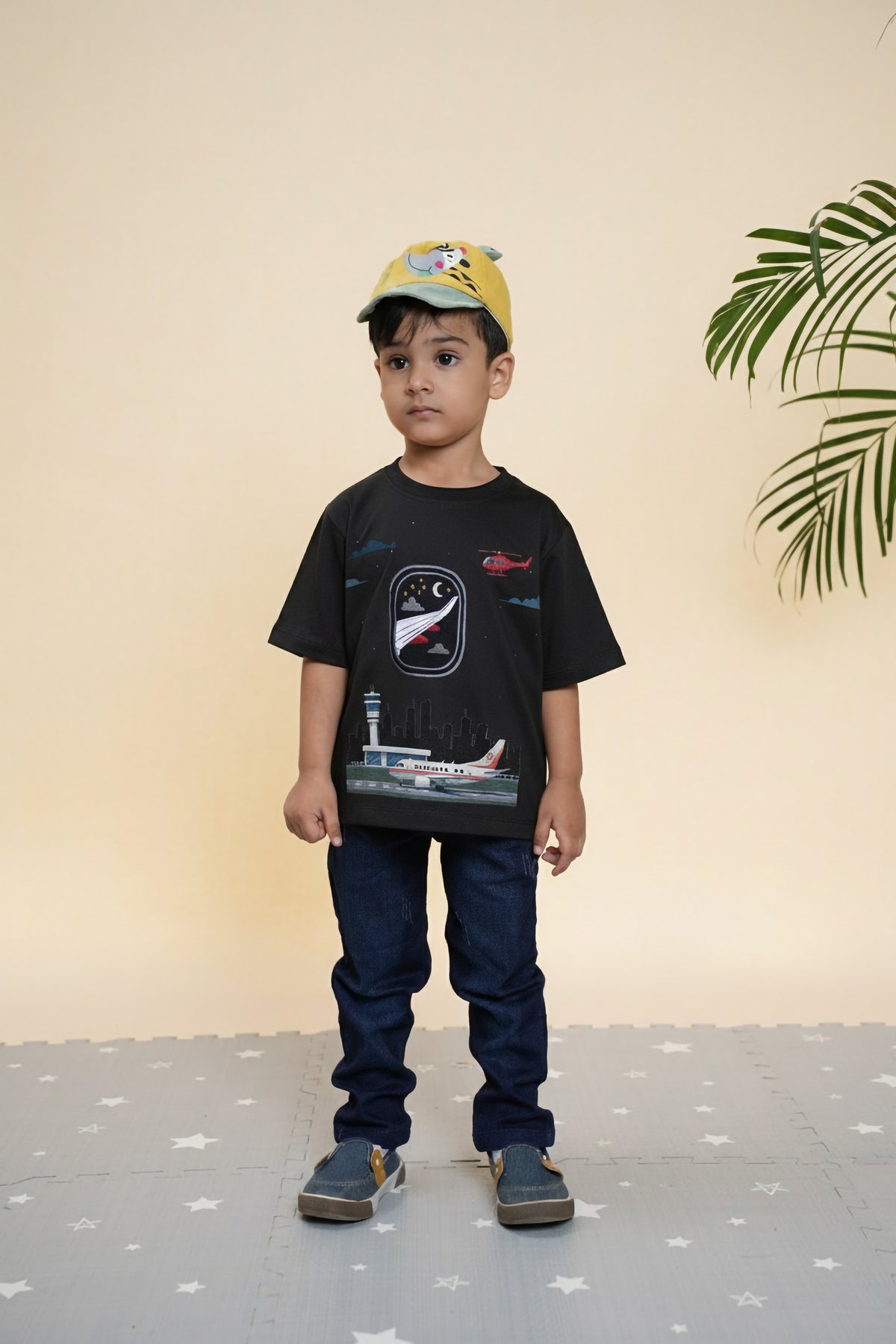 Up, up, and amaze! A crisp plane-window scene in a distinct print with highlighting embroidery that pops—perfect for little jet-setters.
