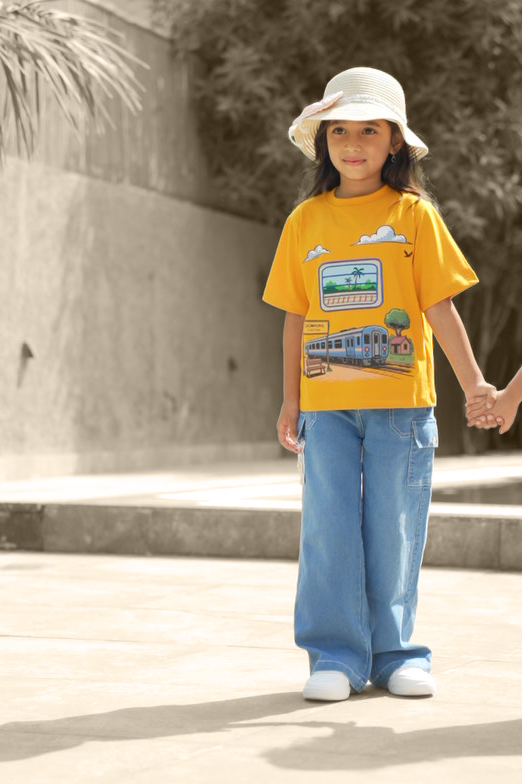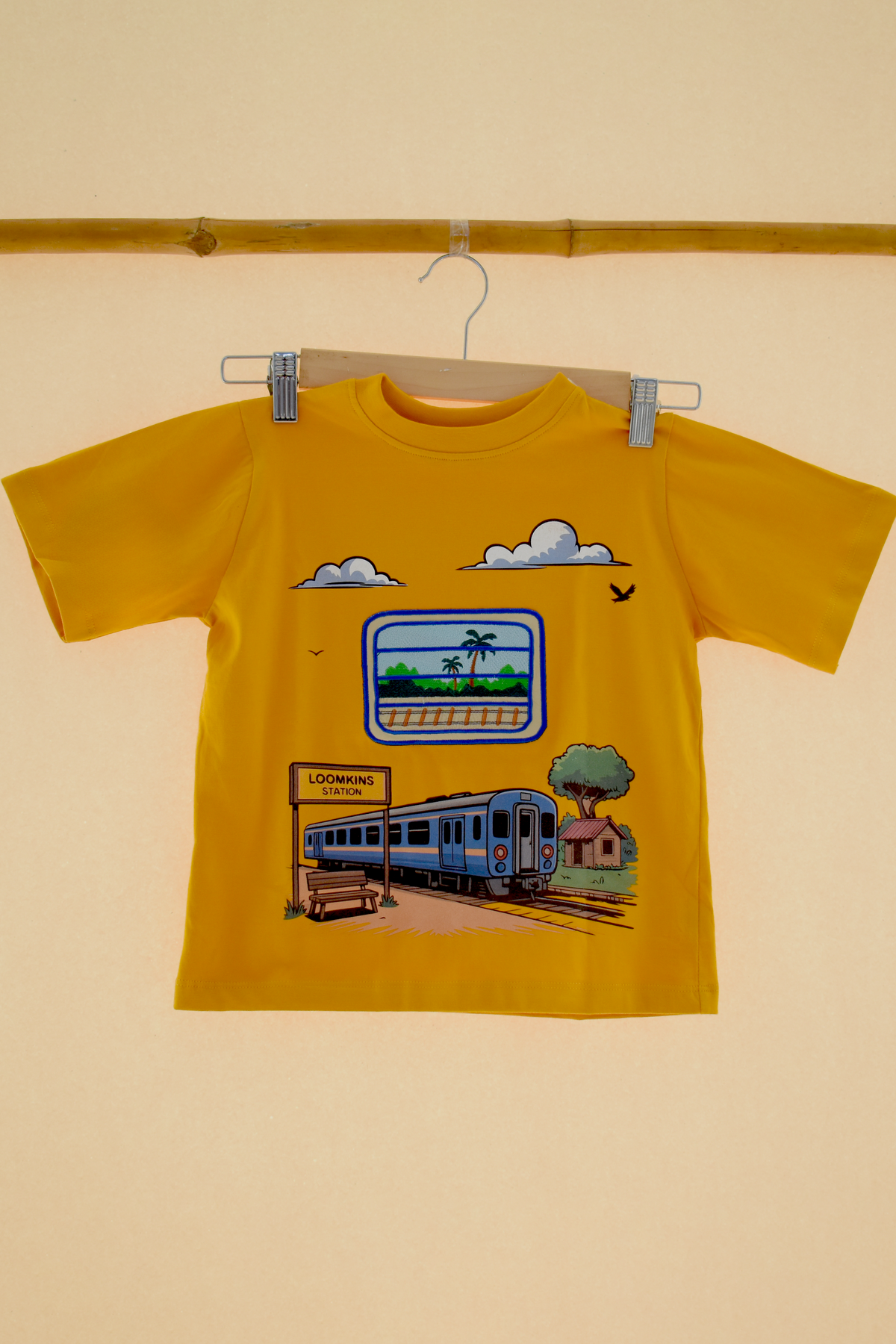 All aboard! A charming train-window view brought to life with embroidery highlights for that tactile, premium finish.