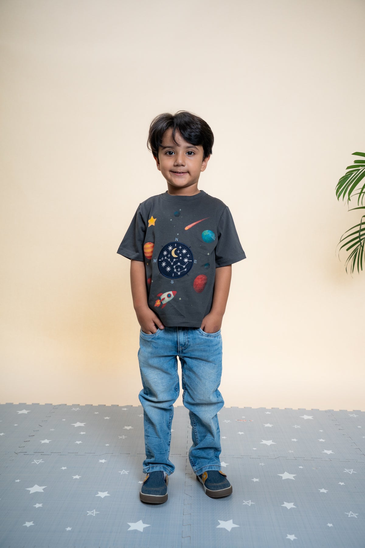 Countdown to play! A space-view print with highlighting embroidery for a premium, textured finish kids love.